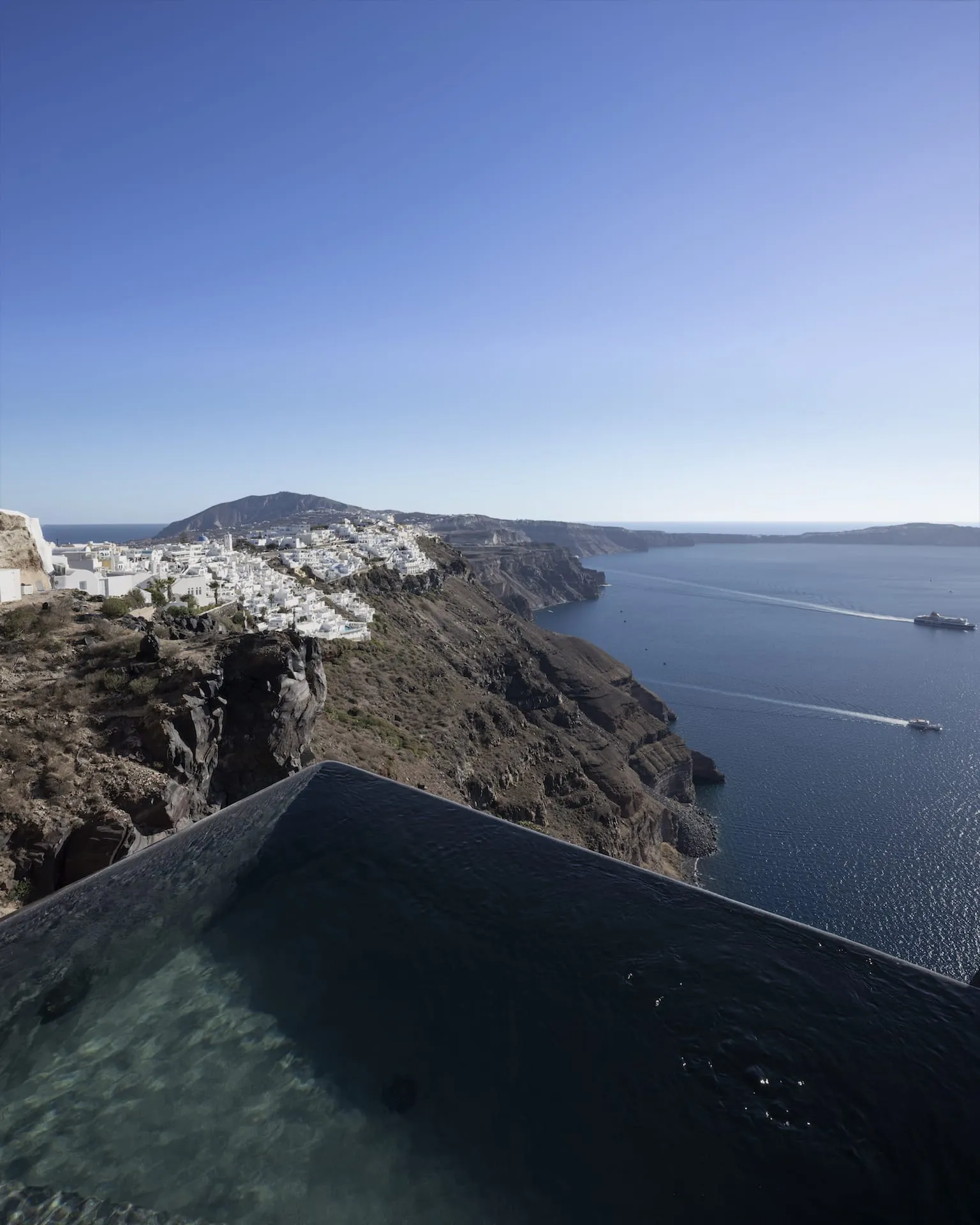Our first stay on the island set the bar impossibly high: Vora Villas perched high on the caldera cliffs in Imerovigli, and carved right into the volcanic rock. Calling it a hotel doesn’t quite capture the magic—it felt more like a private sanctuary in the sky. With only a few suites on the property, Vora is intimate and minimalist in all the best ways: soft architectural lines, natural materials, and design that lets the dramatic landscape do the talking.